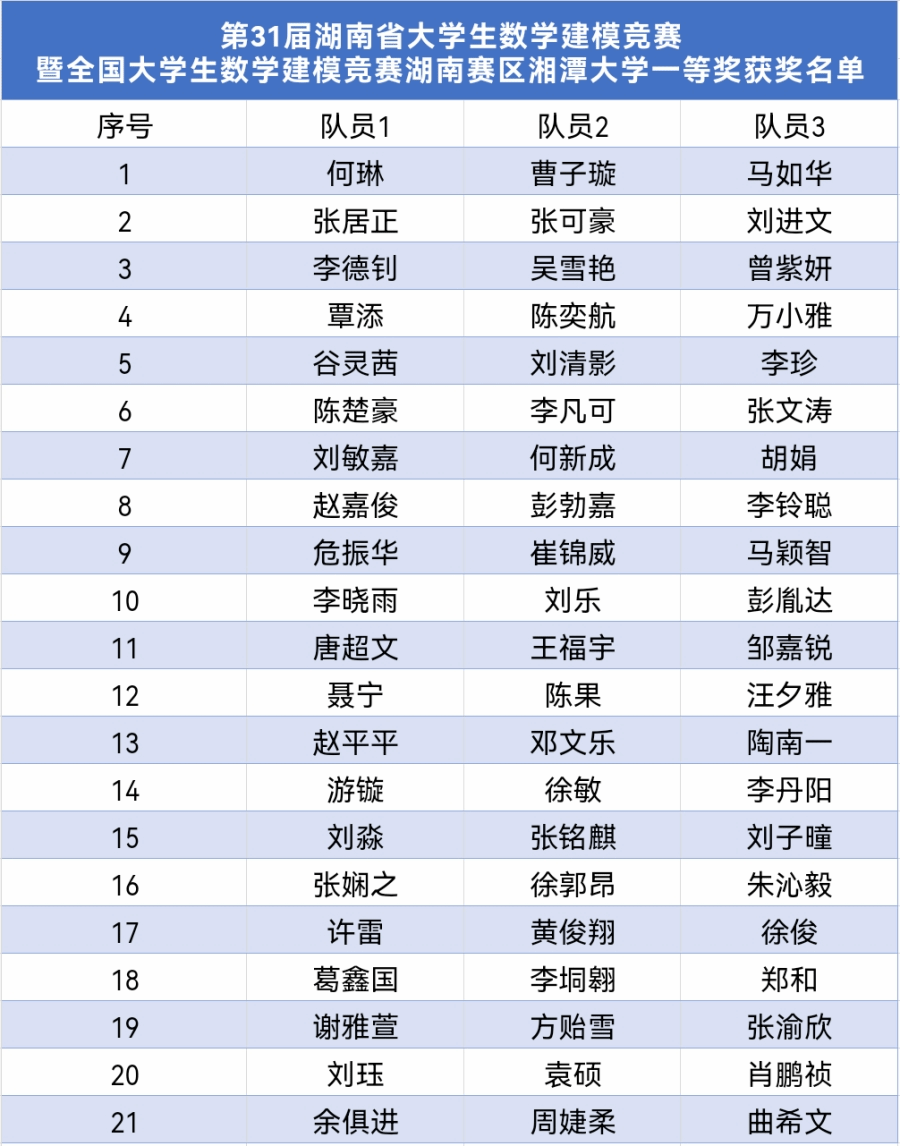 近日,2024年第31届湖南省大学生数学建模竞赛暨全国大学生数学建模竞赛结果揭晓,我校获湖南赛区一等奖21项(获奖率15.4%)、二等奖23项、三等奖23项,一等奖获奖数及获奖率在湖南赛区均排名第一。