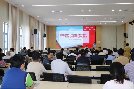 蔡一文还介绍了《中国共产党纪律处分条例》的历史沿革与发展进程,分析新修订条例的主要特点。他认为,用心用情学好《中国共产党纪律处分条例》,才能以高度的政治自觉、思想自觉和行动自觉,强化自我约束,在行动中发挥带头作用。希望全体教职工争做“守纪律、讲规矩”的好教师,严于律己,宽以待人,在工作岗位上尽职尽责,为学院学科建设和人才培养贡献更多更好的力量。