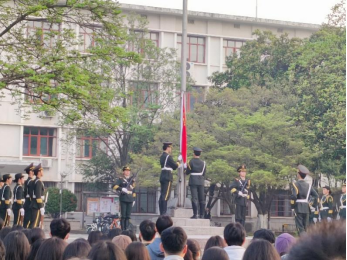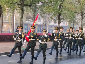 国旗护卫队身着整齐的制服,迈着整齐划一、铿锵有力的步伐,护卫着五星红旗,走向第一教学楼前坪。在庄严的国歌声中,鲜艳的五星红旗冉冉升起,全体师生面向国旗肃立致敬。