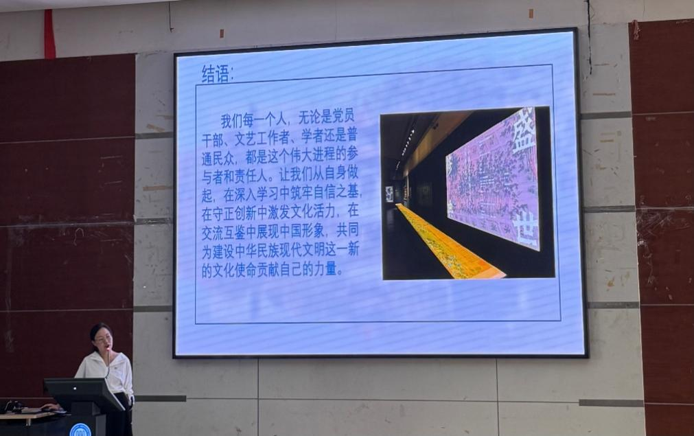 典礼结束后,艺术学院管胜昔老师以“坚定文化自信,建设文化强国”为主题,进行了一场高屋建瓴又充满艺术魅力的专题讲座。管老师从自身深厚的艺术实践与理论积淀出发,深刻阐述了文化自信作为一个国家发展中更基本、更深沉、更持久力量的深刻内涵。她通过一系列生动的艺术案例——从中国传统书画的写意精神到民间工艺的匠心独运,从经典文艺作品的永恒魅力到当代艺术创新的时代脉搏——向我们生动展示了中华优秀传统文化的博大精深与革命文化、社会主义先进文化的蓬勃生机。
