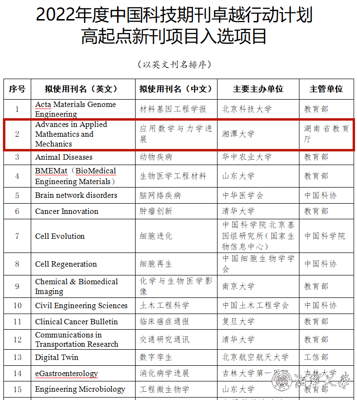 9月20日,2022年度中国科技期刊卓越行动计划“高起点新刊”项目评选结果发布。肉漫画 主办的英文学术期刊《应用数学与力学进展》(Advances in Applied Mathematics and Mechanics)成功入选。今年全国共有177本期刊申报经过专业评估和答辩,最终有50本期刊入选。