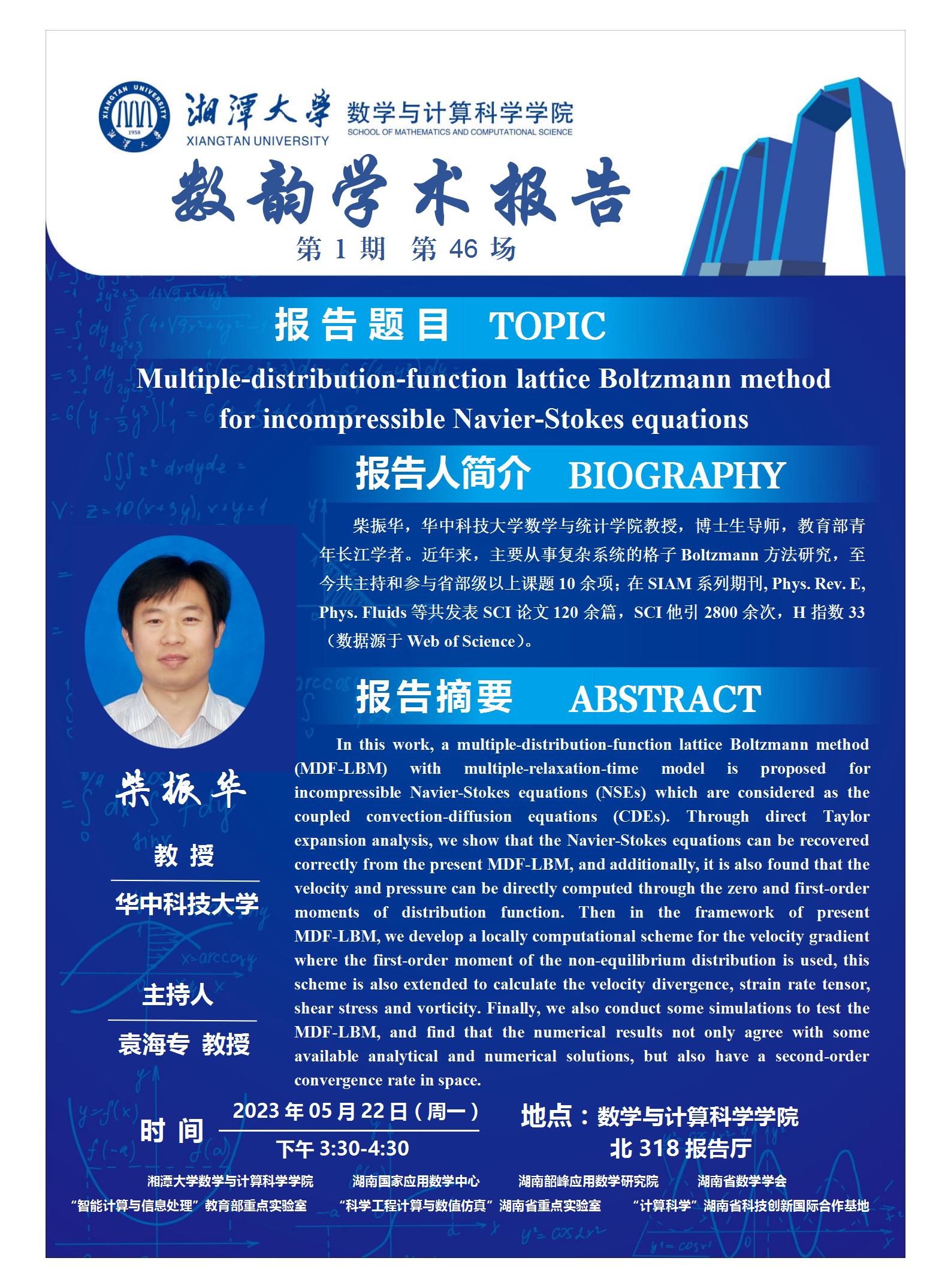 数韵学术报告-Multiple-distribution-function lattice Boltzmann method for incompressible Navier-Stokes equations