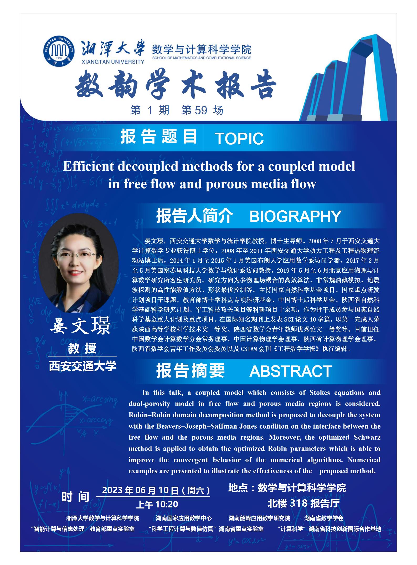 数韵学术报告-Efficient decoupled methods for a coupled model in free flow and porous media flow