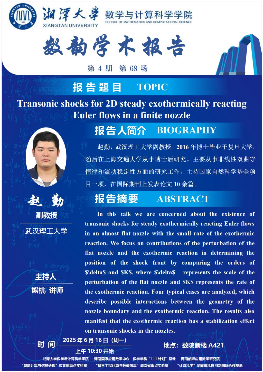 数韵学术报告-Transonic shocks for 2D steady exothermically reacting Euler flows in a finite nozzle