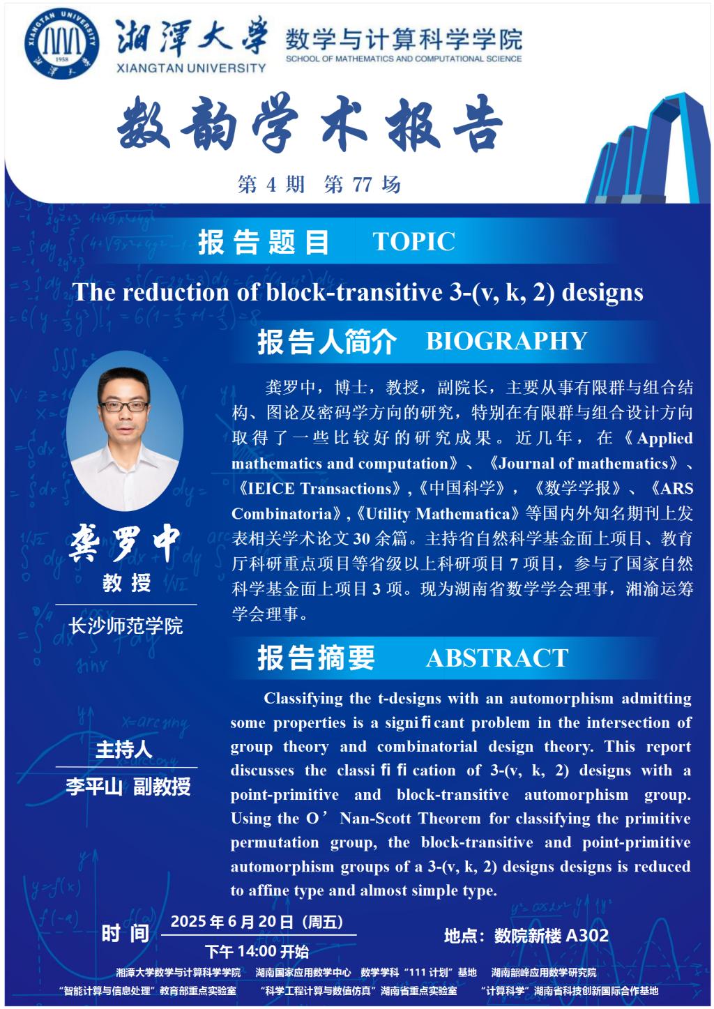 数韵学术报告-The reduction of block-transitive 3-(v, k, 2) designs