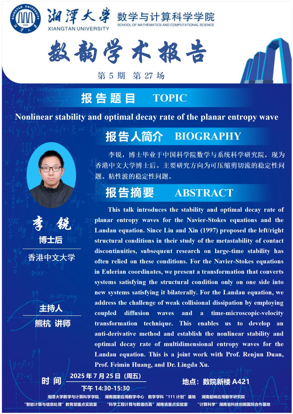 数韵学术报告-Nonlinear stability and optimal decay rate of the planar entropy wave