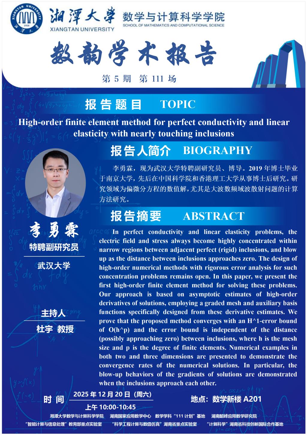 数韵学术报告-李勇霖-High-order finite element method for perfect conductivity and linear elasticity with nearly touching inclusions