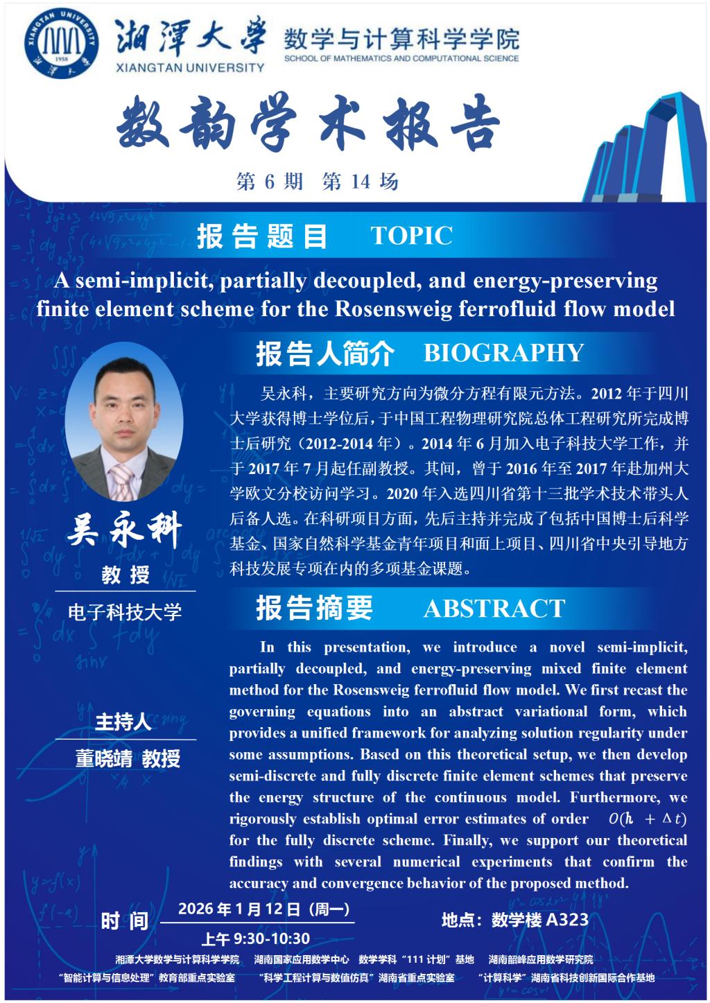 数韵学术报告-吴永科-A semi-implicit, partially decoupled, and energy-preserving finite element scheme for the Rosensweig ferrofluid flow model