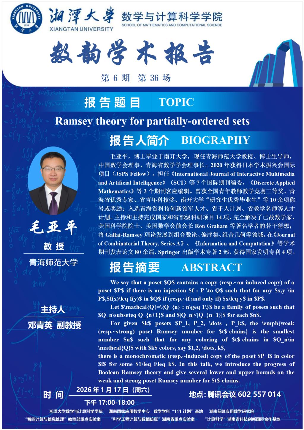 数韵学术报告-毛亚平-Ramsey theory for partially-ordered sets